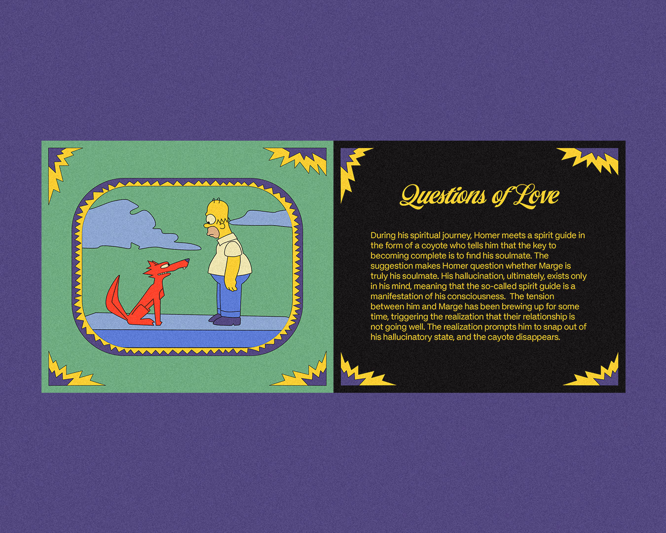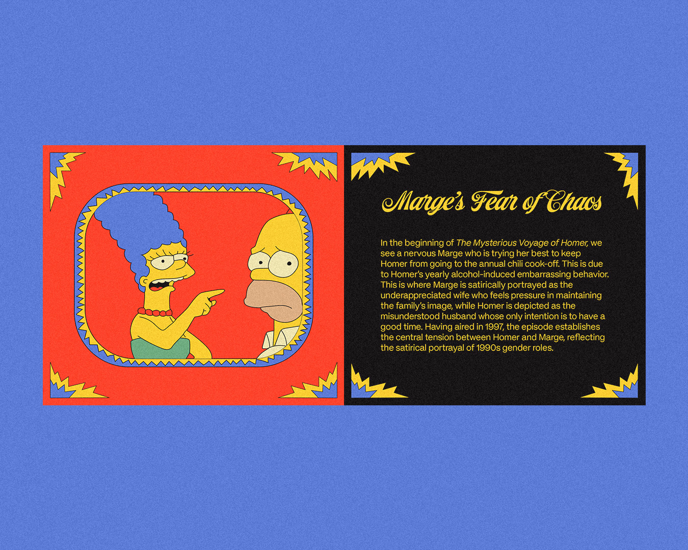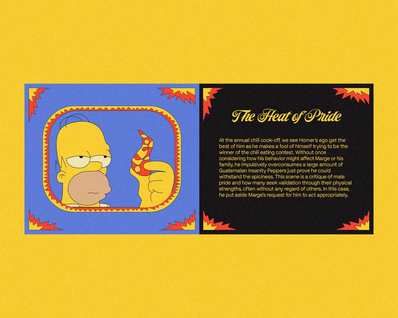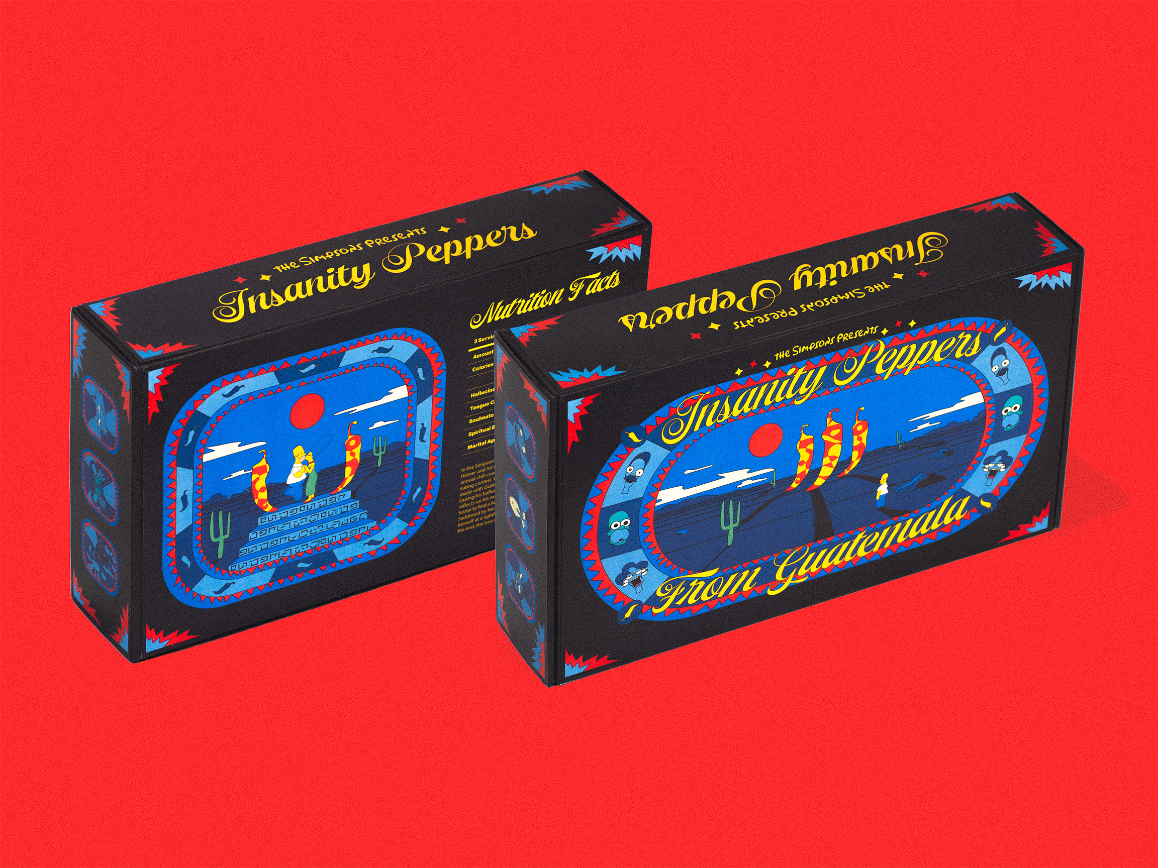 Insanity Peppers is a packaging project based on The Simpsons episode The Mysterious Voyage of Homer, visually analyzing the episode and its cultural significance. It explores how the era and social context influenced its themes while at the same time delivering the full experience of the episode’s storyline and visuals. The project includes the “insanity peppers” central to the plot, a guide that walks the viewers through the analysis, and a back design that highlights major themes through exaggerations presented as “nutrition facts.”
